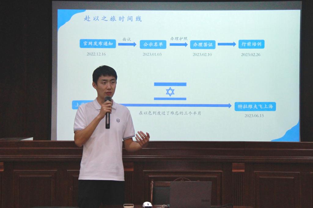 交流会上,王阳同学首先就他在以色列访学的基本情况进行介绍,包括项目申请流程、以色列地理位置概况、访学学校简介等。其次从课程学习、访学游览、人文交流三个方面讲述了访学的所见所闻,向在场同学们娓娓道来,为大家展示了戈兰高地、耶路撒冷、特拉维夫、海法等地的风土人情,充分调动了讲座气氛,并为大家今后选择合适的访学项目、积极参与国际化合作交流提供了建议。跟随他的脚步,同学们憧憬异国访学的精彩体验,深入思考选择留学的意义所在。王阳鼓励同学们勇于追求理想,锻炼语言表达能力,不断提高自身综合能力,能够在世界舞台上发出中国声音。