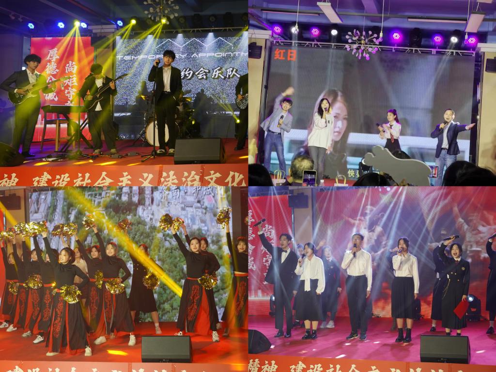 未央艺术团带来的作品《锦鲤抄》将轻盈的舞姿与悠扬的歌声结合,勾勒出一幅古香古色的优雅绘图;舞蹈《生命力》展现了法学学子的青春活力;大学生法律援助中心带来的小品节目《法援在行动》,以生动新颖的方式、幽默诙谐的表演,警示大家要增强反诈意识,维护法律的权威;2023年山东省“学宪法、讲宪法”一等奖获得者郑海霞同学带来朗诵《追寻宪法根基,守护人民福祉》表达了法学学子弘扬宪法精神,坚定法治信仰的决心。