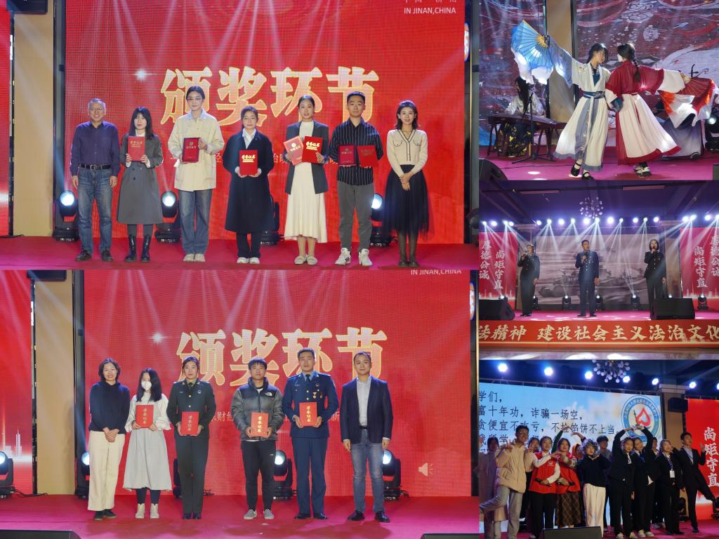 第四届法律文化节知识竞赛、辩论大赛中获奖的同学们颁奖。精彩的节目表演之余,晚会还进行了多轮抽奖环节,将气氛推向高潮。