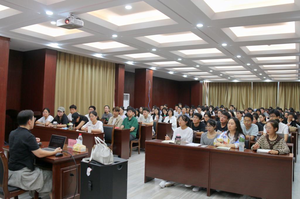 ;其次,“你来这里做什么 ”——明确好专业的培养方案;最后,关于学位论文的提示——科研要求早规划、选题方向早确定、论文初稿早完成。“知者行之始,行者知之成”,张闽勉励同学们要明确自己的方向,通本心筑根基,铸匠心塑技能,跨越山海,抵达彼岸。