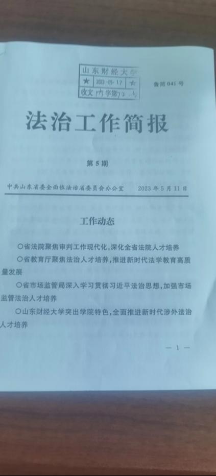 2023年5月份中共山东省委全面依法治省委员会办公室在其《法治工作简报》(鲁简041号)中重点介绍了威尼斯人官网涉外法治人才培养的经验。中共山东省委全面依法治省委员会办公室的《法治工作简报》是省委全面依法治省委员会全面推进山东省法治建设的重要抓手和重要平台,通过该平台全面推广和介绍各地、各部门以及有关单位在法治山东建设方面的经验,并依据该平台推广各地、各部门取得的较为成熟的经验,同时通过该平台也进一步传达山东省委全面依法治省委员会当前的法治工作要求。到目前已经刊发了41期。
