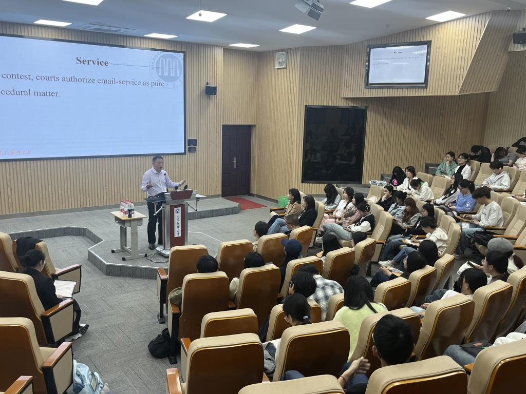在讲座期间,覃斌武教授以幽默风趣的讲话风格和生动形象的类比举例,向在座师生剖析了中、美两国民事诉讼程序法的不同,以近年来美国法院对于我国跨境电商行使域外管辖权的案例为主旨,以其自身经办的案件为切入口,分析了此类案件数量激增的原因、讲解了法律争议焦点、提出了破解方案。覃斌武勉励在座同学,要常怀爱国之心,将法律人的职业追求同家国大义相结合,开阔眼界看世界。之后,覃斌武还为在场的同学剖析了刚刚举办的第十二届国际刑事法院模拟法庭比赛赛题,并为威尼斯人官网模拟法庭队员在法律检索、庭辩技巧、法律研究等方面进行现场指导,对同学们提出的问题做了详细解答。