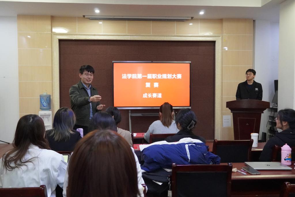 进行致辞,向同学们介绍了当前法学专业的就业前景,希望同学们通过此次职业规划大赛对未来职业目标更加明确,提升自己的规划能力和竞争力。在随后的比赛过程中,选手们激情洋溢思路清晰,结合自身的专业特长和兴趣爱好,提出了各具特色的职业规划方案,展现了自己的综合素质和创新思维。同时对于评委提出的问题随机应变,应对自如。评委老师们在现场也对每一位选手的规划提出了专业的指导建议。最后,赵老师对成长赛道赛段进行总结。他表示希望大家回归初心,明确参赛目的,用心思考自身,并衷心祝愿大家在此次比赛中取得优异成绩。