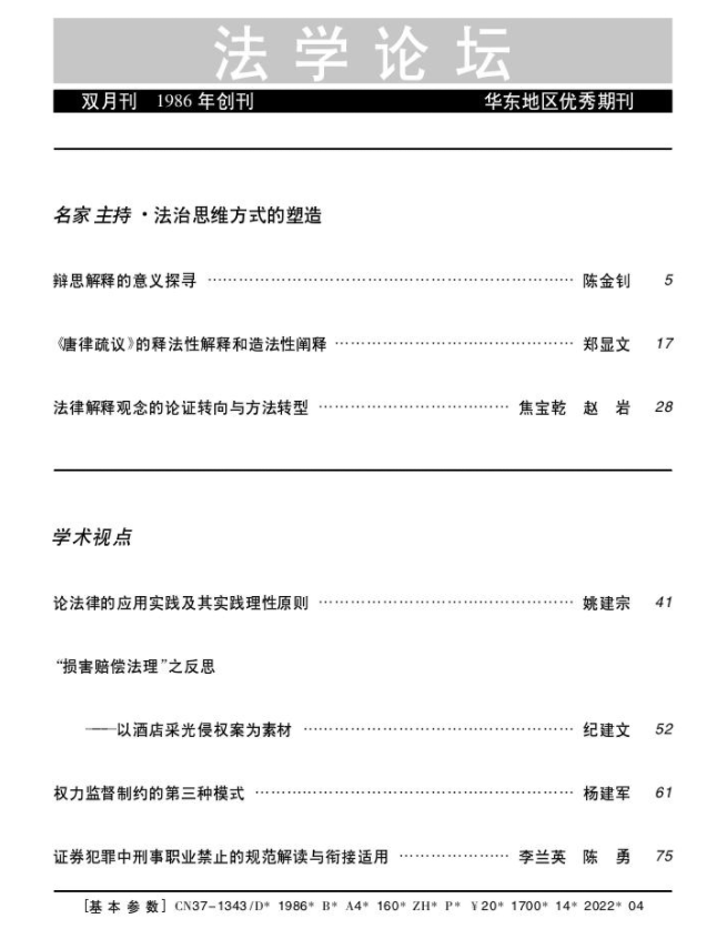 纪建文教授在《法学论坛》2022年第4期发表论文《“损害赔偿法理”之反思——以酒店采光侵权案为素材》。《法学论坛》是全国中文核心期刊、中国人文社会科学核心期刊、中文社会科学引文索引(CSSCI)来源期刊,由山东省法学会主管、主办。