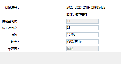 5、经常有老师写错了“待调整周次”和“调整后周次”,请认真看下面截图,以免打回重弄。比如:第14周的课,调到第15周