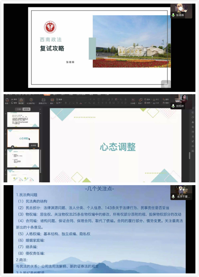 借助网络平台举行了研究生复试经验分享会,邀请三名在去年研究生考试中取得骄人成绩的优秀校友分享了复试经验。本次分享会由就业指导办公室负责人郭蕾主持,威尼斯人官网2020届法学毕业生以及21届22届的部分同学参加。
